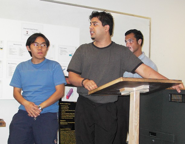 ![]() Shown above are some pictures from Design Project presentations and tour of the Class 1000 Cleanroom & Anechoic Chamber (RF Lab) at UCI's Integrated Nanosystem's Research Facility (INRF). Highlights of ME685 Group Projects: